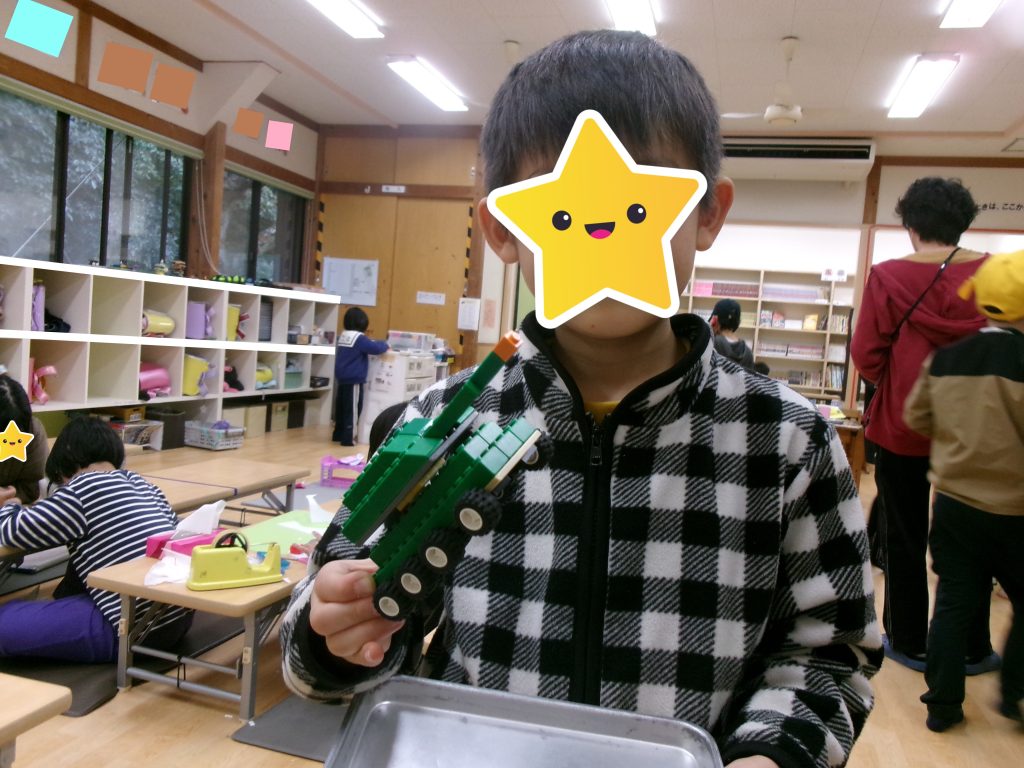 「僕は。戦車を作ったよ。」男の子が持って来てくれたのは、レゴで作った戦車。本物そっくりに作っていて、砲塔が360°回転できるようになっています。主砲からは砲弾が飛び出しそう。