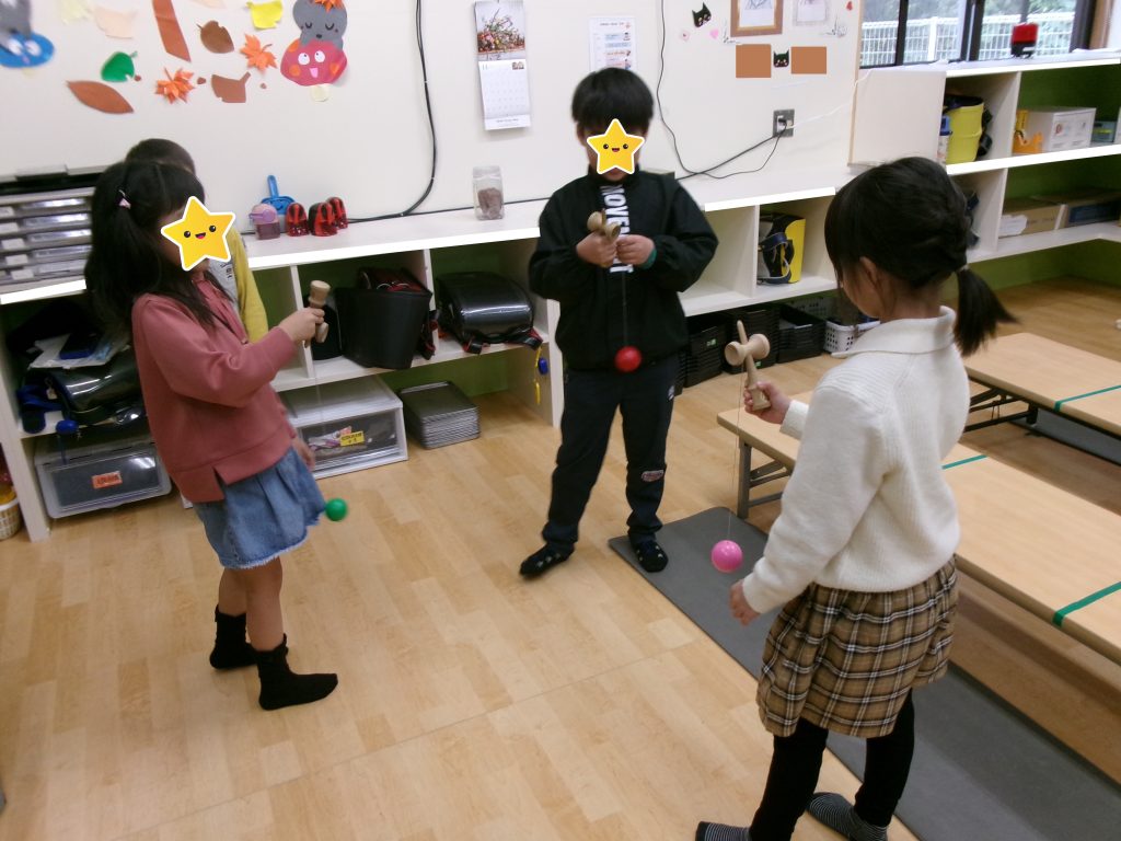 三人でけん玉勝負!誰が上手に乗せることが出来るかな?