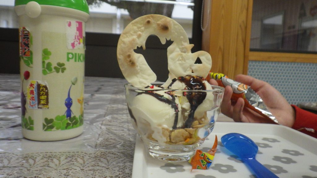 お化けやネコ・ジャックオーランタンのパリパリせんべいが刺さっていて、喜んで食べてくれました!